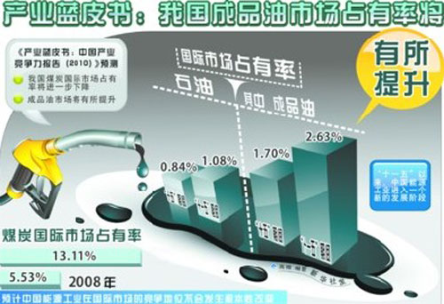 中國社會科學院22日在北京發(fā)布的《產業(yè)藍皮書:中國產業(yè)競爭力報告(2010)》預測,我國煤炭國際市場占有率將進一步下降,成品油市場將有所提升。