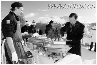 午餐時(shí)分,與會(huì)代表們紛紛裹緊外套,穿上大衣,離開暖氣燒得火熱的餐廳,來一頓戶外露天午餐。幕天席地與自然環(huán)境親密接觸,不失為親身體驗(yàn)氣候變化的好方法。但愿面對(duì)冰天雪地飽餐的同時(shí),代表們能思考出應(yīng)對(duì)氣候變化的更好辦法。