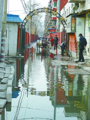 據(jù)居民介紹,西馬場(chǎng)北里只有這一條東西走向的胡同,居民出門、購(gòu)物都必須走這條路。可現(xiàn)在路面每天汩汩往外冒臭水,人們只好用方磚沿著胡同北面鋪了一條窄路勉強(qiáng)通行,而現(xiàn)在那些方磚也被臭水淹沒(méi)了,居民通行更加困難。