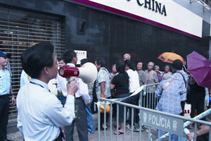圖:銀行派人安排輪候者進(jìn)場(chǎng)。(圖片來源:澳門日?qǐng)?bào))