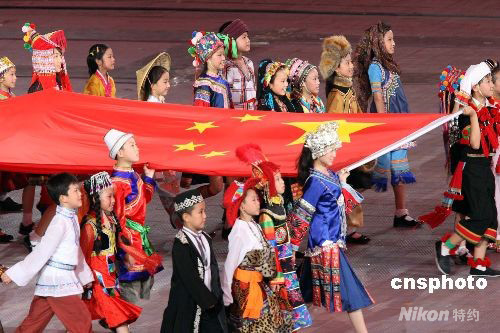 第二十九屆夏季奧運(yùn)會(huì)8月8日晚在北京奧林匹克公園內(nèi)的國(guó)家體育場(chǎng)舉行開(kāi)幕式,中國(guó)各民族兒童簇?fù)碇r艷的中國(guó)國(guó)旗入場(chǎng)。 中新社發(fā) 任晨鳴 攝