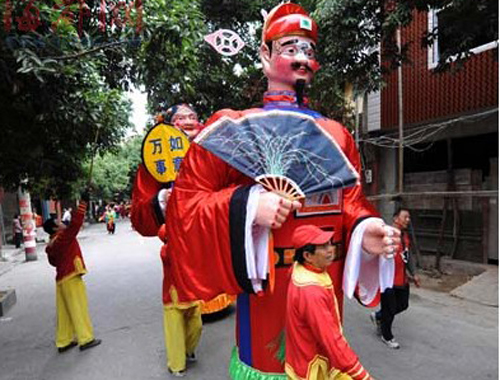 從聚寶街路角的黃帝宮出發(fā),五六百人的出巡隊(duì)伍沿著橫街、青龍宮、斗門頭、車橋頭、水上派出所、聚寶新城等線路一路走來(lái),最后經(jīng)中山南路、天后宮、聚寶街等路線,再回到黃帝宮。一路走來(lái),隊(duì)伍吹拉彈唱,富有閩南特色的有驢子探親、立高人、高蹺表演等,連經(jīng)過(guò)的小車司機(jī)也停下觀看。另外,隊(duì)伍里還有11匹馬,模仿大禹坐馬車出行的陣容。