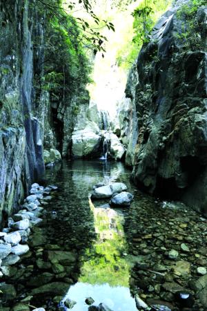 沿著黃巢山盤旋而上,到半山時下車,順山腰行20分鐘,就進(jìn)到峽谷。谷底是滿眼美麗的鵝卵石———這是峽谷下游的河床,溪水蜿蜒數(shù)公里,再匯入晉江。冬季水枯,光溜溜的鵝卵石,密布河床。潺潺溪水,沖出圈圈水紋,太陽映在潭底,光影動人。