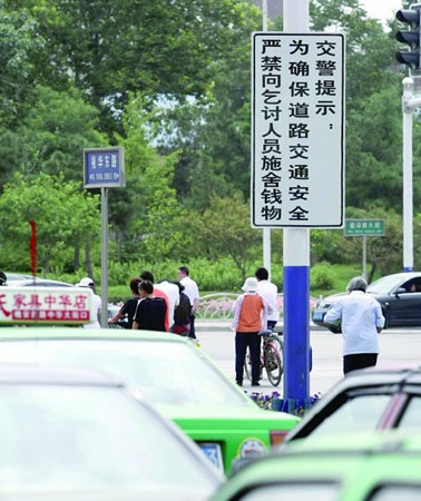 近來,在省城石家莊“迎賓大道”裕華路與建設(shè)大街交叉口,交管部門豎起的兩塊“新式”交通警示牌引發(fā)市民議論!盀榇_保道路交通安全,嚴禁向乞討人員施舍錢物”的警示語赫然入目,對此,記者在采訪中也聽到了社會各界的一些不同看法。