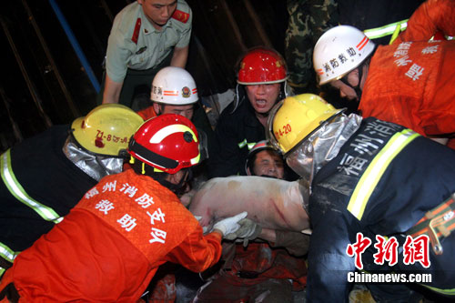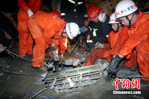 隨著救援進程在加快,一塊塊阻礙救援的鋼筋混凝土樓板和房梁被移開!袄靡簤褐喂ぞ甙褬前鍝纹饋恚瑠A縫里有人!”為避免現場再次塌落,救援官兵利用液壓支撐工具把三樓樓板撐起來。21時55分,消防官兵在現場北面搜又救出1名被埋人員。