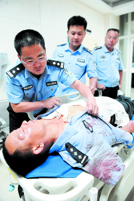 昨晚10時,在湘雅醫(yī)院急診科,這名受傷交警正微閉著眼睛,躺在擔架上等待放射檢查,蒼白的臉上透露出虛弱。他的警服和警褲上有大面積血漬,白色背心也被撕爛,甚至連襪子和皮鞋都被鮮血浸透。他頭部的右額位置有一個很大的腫塊,沾滿血跡的右手中指縫合10針后被紗布包著,身上還有多處擦傷。