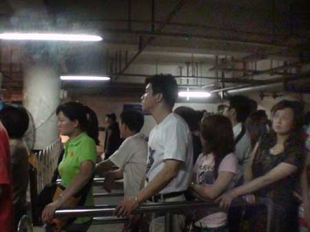 7月29日晚9點多,記者進入火車站出站口,沿著指示牌上的“的士候客點”,隨人流一起來到地下停車場昏暗高溫的地下停車場里乘客們個個汗流浹背 排著,長隊等候出租車。奇怪的是,偌大的停車場內(nèi),看不到一輛出租車。
