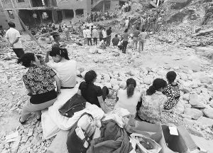 她家的樓房一大半被埋入黃土,露頭的斷壁殘垣,也被沖得嚴重移位,往南挪了幾米。泥石流吞噬了她的老伴和小兒子。一整天,她都坐在一床舊棉被和一條舊毛毯上發(fā)呆,那是她救出的全部家當。唯獨陌生人楊金鳳獲救的那一刻,老人才忘情地拍手叫好。
