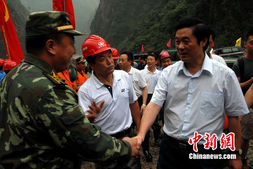 中新網(wǎng)綿竹8月17日電(王超)17日下午13時(shí)50分許,中共四川省委書記劉奇葆、副書記李崇禧,副省長鐘勉帶隊(duì)查看小崗劍道路搶通現(xiàn)場(chǎng),親切慰問了在場(chǎng)搶險(xiǎn)的公安、消防、武警、省路橋公司等單位代表。