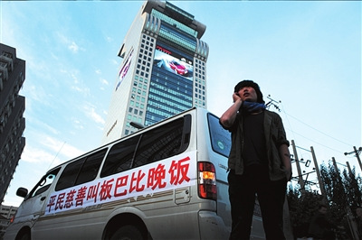 “平民慈善叫板巴比晚飯!弊蛱煜挛5點(diǎn),朝陽區(qū)北四環(huán)中路盤古大觀酒店樓下,一輛白色面包車身上的挑釁口號引得周圍市民駐足觀看。