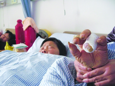昨天中午,記者在高淳縣人民醫(yī)院見到了邢老太,她此時躺在病床上,正在掛水,面色異常蒼白,一旁的女兒雙眼通紅,不住地?fù)崦赣H的手臂!罢媸翘^分了,他們能這樣對待一名老人嗎?”女兒哭著告訴記者,那少了的一節(jié)手指就是被城管隊員硬生生扯斷的。