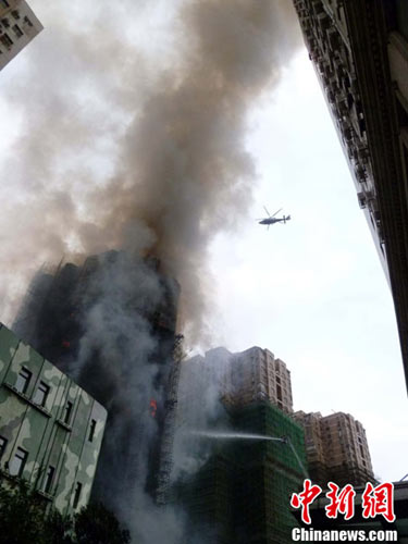 在火災(zāi)現(xiàn)場,記者看到,起火高樓外表已被燒黑,現(xiàn)場火勢洶洶,濃煙滾滾;附近道路地面上覆蓋了大量灰燼,水流滿地;周邊方圓數(shù)百米內(nèi)充滿了煙霧和刺鼻的氣味;來自交警方面的信息稱,失火大樓周圍數(shù)條道路已被封鎖。記者看到,不僅消防車緊急出動,警用直升飛機也參與高樓救援。