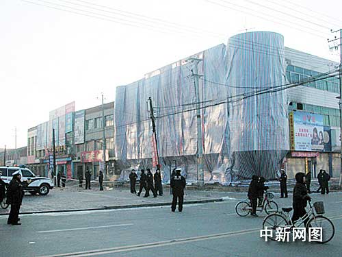 31日上午八點(diǎn)多,失火商場(chǎng)所在街道仍被警方封鎖。記者在現(xiàn)場(chǎng)看到,失火商場(chǎng)樓層被帆布遮蓋,道路兩側(cè)眾多群眾圍觀,有多名警察在樓前值守。