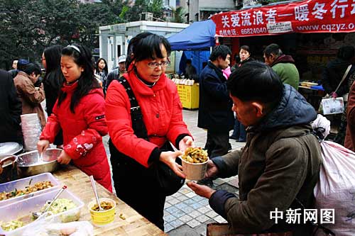 “給流浪者送飯吃,是作秀。我們就是要通過這種作秀,來呼吁更多的人做這樣的‘慈善秀’”。正在給流浪者舀飯菜的施飯組織者楊伊婧坦言。