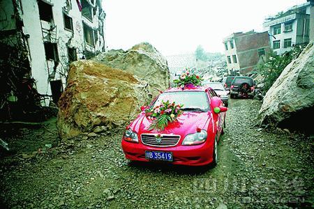電話里,新郎喬貴田很開心:“沒想到,一夜之間,我的婚車隊成了牛年最;檐嚒覜]有想過弄個什么最牛,只是想,我們原定2008年國慶結(jié)婚的,可地震了……我和陳佳就商量:再難過,生活也要過,等歷史重新翻開一頁的時候,我們就結(jié)婚。因為她在鄧家,迎親必須穿過縣城,我想通過縣城迎親,絕對一輩子終身難忘。于是,就找管關(guān)卡的領(lǐng)導(dǎo)通融,領(lǐng)導(dǎo)一聽,竟破例讓我們通過……”