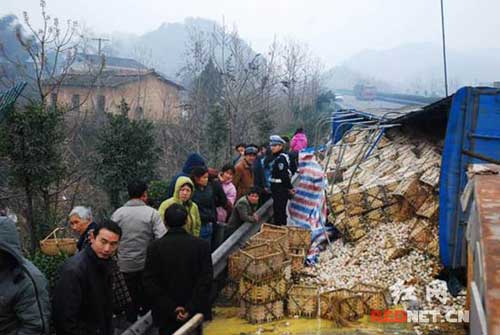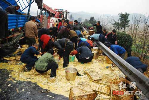 1月4日早晨6時40分,一輛滿載7噸鮮鴨蛋的湖北小貨車,由北往南行駛至京珠高速高速公路長潭段212公里時,因躲避快速車道的一輛汽車超車側(cè)翻,10萬多只鴨蛋傾覆在近8米長的高速公路路肩上。附近近百村民聞訊前來哄搶,現(xiàn)場一片狼藉。
