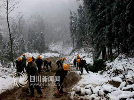 由于2008年12月底寒流影響,北川境內氣溫急劇下降。“1日凌晨,擂鼓鎮(zhèn)境內高山地區(qū)就開始下雪了。”當?shù)厝罕姼嬖V記者!1日下午,接到市交通局通知會議,研討擂禹路搶險方案,2日就開進隊伍進行搶修,目前,B段搶修工程已接近尾聲!盉段維護工程隊負責人黃傳能說!懊盎鹕巾(C段)已經結起了厚厚地一次冰,昨(4)日市、縣領導才去看了,根本無從下手!盉段維護隊挖掘機手周會林如是說。