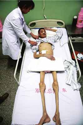 昨天下午,記者在軍區(qū)總院普外科病房見到了耿松峰,他雙臂向上彎曲放在枕邊,右側(cè)肩部正進(jìn)行靜脈營養(yǎng)注射,一袋普通塑料袋大小的乳白色液體已經(jīng)見底。他說話吃力,但仍然翕動著嘴唇說:“伯伯(指普外科主任)是個好人!鄙砀1.72米、體重曾60公斤的他現(xiàn)在只有33公斤,大腿也只有成年男性手腕粗。他母親用極不流利的普通話說,因?yàn)閮鹤拥牟,已?jīng)家徒四壁,親戚、高利貸,各種借錢的方法都想到了,已經(jīng)花了20多萬,可還是不夠,兒媳也因此要離婚。“現(xiàn)在已經(jīng)欠醫(yī)院5萬塊錢了,可我也不能看著兒子死啊”。
