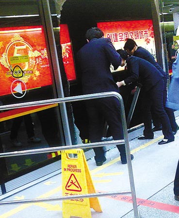 記者隨后在農(nóng)講所地鐵站臺(tái)看到,破裂的是第14和15道門。由于工作人員反應(yīng)較快,地面破碎的玻璃片已清理得一干二凈,地鐵也恢復(fù)正常通車。破碎玻璃墻外被鐵欄桿牢牢圍住,以防止因乘客擁擠而掉入地鐵軌道。兩扇出入地鐵列車的門已被封閉,禁止乘客出入。欄桿旁邊有工作人員在為落站的乘客指引乘車路線。