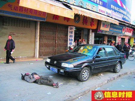 記者接報趕到現(xiàn)場看到,一輛黑色小轎車停在拐角處的人行道上,車底下躺著一名中年男子,年約40,蓬頭垢面,衣服破爛,光著臟兮兮的腳。他的臉上血跡斑斑,上衣拉到了胸口,倒在地上一動不動,后來120急救車趕到,證實其已不治身亡。