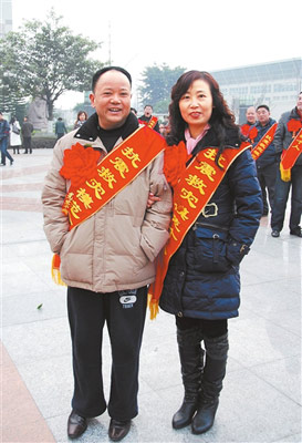 在什邡市政府研究室副主任廖曉軍的相機(jī)里,有一張劉慶祿夫妻披著抗震救災(zāi)模范綬帶的照片。廖曉軍說,去年12月30日,市委、市政府召開抗震救災(zāi)表彰大會(huì),辦公室通知?jiǎng)c祿參會(huì)時(shí),他說自己正在值班,要去幾個(gè)受災(zāi)鎮(zhèn)發(fā)放過冬物資,就不參加了。因?yàn)樗鳛槟7秱(gè)人代表不能缺席,于是就一再通知他務(wù)必到會(huì)。最后,他來不及回家換件衣服,就直接從倉庫趕到大會(huì)現(xiàn)場(chǎng)。也在這里,留下了生前最后的影像,也是和妻子的最后合影。
