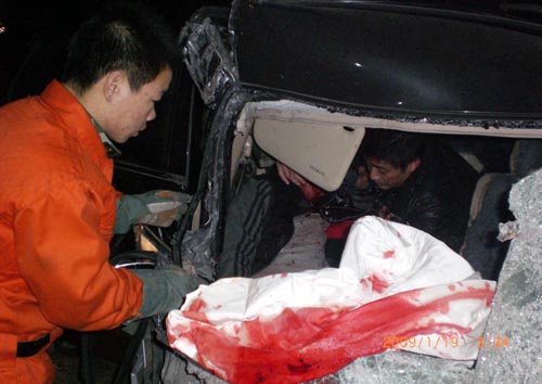 凌晨3時14分,接到報警后,漯河源匯區(qū)消防大隊特勤中隊中隊長彭中明立刻帶領一部搶險救援車10余名隊員火速趕往事故現(xiàn)場。距離現(xiàn)場50米外,就能看到一列長長的火車停在南環(huán)路中間,把進入漯河市區(qū)內(nèi)的幾條主要通道牢牢堵死,造成進出漯河的幾輛汽車無法通行。來到事故現(xiàn)場,只見一輛小轎車的車頭被撞得面目全非,擋風玻璃被撞碎,車前的引擎蓋被撞得凸了出來,一名40多歲的司機滿臉是血,嘴里不停地發(fā)出微弱的呻吟聲。由于他的雙腳被卡在變形的車體內(nèi),現(xiàn)場的交警經(jīng)過多次努力最終沒能將其救出。