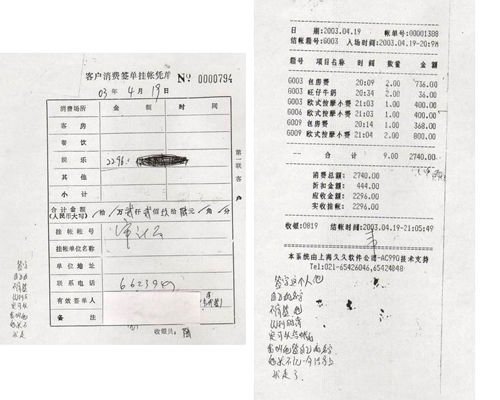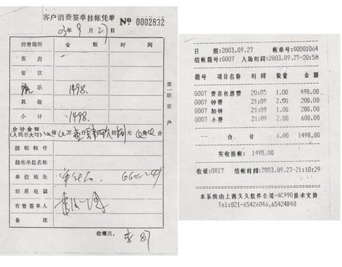 結(jié)賬小票上列明的服務(wù)包括貴賓包房費(fèi)、鐘費(fèi)、加鐘、小費(fèi)、飲料等。第一次消費(fèi)的時間為2003年4月19日,入場時間為晚8點09分,結(jié)賬時間為晚9點05分。總消費(fèi)金額為2296元。其中,包房共計3間,費(fèi)用為1104元(368×3);歐式按摩小費(fèi)共有3筆,其中兩筆分別為400元,另一筆則標(biāo)明數(shù)量為2,金額為800元。另一份賬單的時間為2003年9月27日,入場時間為晚上8點03分,結(jié)賬時間為晚9點10分?傁M(fèi)金額為1498元。其中“貴賓包房費(fèi)”是498元,鐘費(fèi)是200元,加鐘是200元,小費(fèi)是600元。