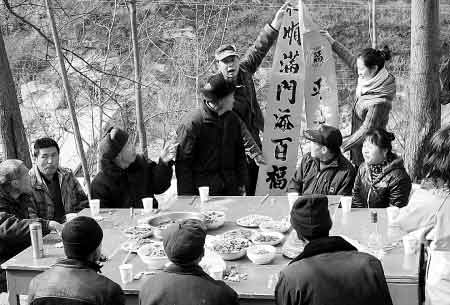 “范伯、李哥、狗娃、毛娃都來,上菜開席咧”!昨天中午,秦嶺山中的長(zhǎng)安區(qū)龍石溝徐師傅家的小院內(nèi)熱鬧非凡,坐席的村民們喜笑顏開!凹t燒獅子頭、細(xì)沙八寶、燒雞、砂鍋,來嘍”一陣招呼后,郭建民和妻子、女兒將一盤盤精心準(zhǔn)備的飯菜端上桌。