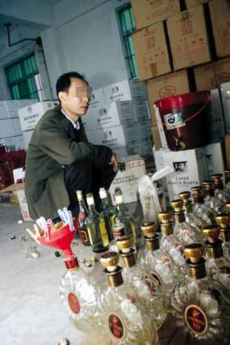 在中山市西區(qū)金葉市場的一個窩點(diǎn),搜查人員在倉庫中搜出大量假冒洋酒和假冒國產(chǎn)名酒。同時繳獲的賬本顯示,許多假酒都賣給了市內(nèi)一些酒店和KTV、酒吧等娛樂場所。據(jù)制假的“老板”交代,他們收購廉價洋酒后,再勾兌色素灌入洋酒瓶,一分鐘就能生產(chǎn)一瓶“洋酒”。冒牌國產(chǎn)“名酒”,也是勾兌廉價國產(chǎn)白酒做成的。