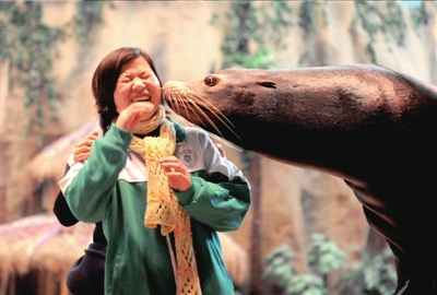 昨天,得到海獅浪漫之吻的這一刻,來自青川災(zāi)區(qū)的初三學(xué)生杜穎慧既害怕又興奮。本報記者 張斌 攝