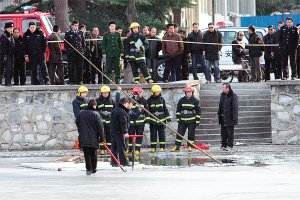 事發(fā)現(xiàn)場,吞噬了年輕男子的冰窟緊靠敬業(yè)湖南岸。公安、消防人員將敬業(yè)湖緊鄰北洋道一側(cè)的湖岸封鎖,7個民警沿著親水平臺走上冰面,用竹竿在冰下摸索著。時間一分一秒地過去,救援人員找來一塊長方形木板,當作筏子艱難地破冰搜救。一個半小時過去了,救人的“筏子”漸漸向湖心移動,搜索的竹竿在一米一米地加長,但水下沒有一點動靜。