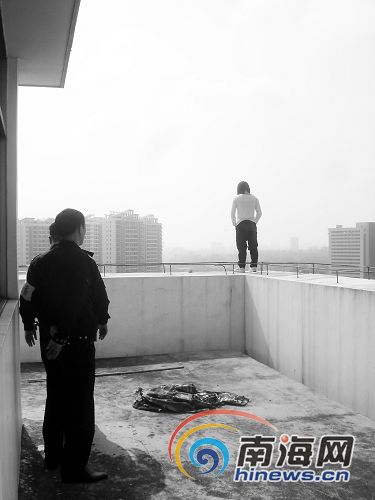 15日下午2點(diǎn)多鐘,16歲女孩阿春(化名)來(lái)到?邶埨ツ下贰胞惒ɑ蕦m”所在酒店的樓頂要跳樓自殺,海口民警、消防人員及120急救醫(yī)生緊急趕往現(xiàn)場(chǎng)救援。一個(gè)多小時(shí)后,消防人員和民警才把阿春從樓頂邊緣救下來(lái)。