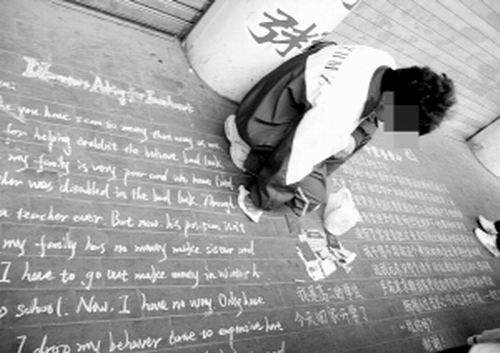 男孩的面前擺放著幾本“證件”和幾張零散的紙幣,在證件的前邊用藍(lán)色的粉筆寫著:“我是高二的學(xué)生,今天回家開學(xué)了!痹诘匕迳希用中文和英文兩種語言寫了“千里尋愛心”的求助信。