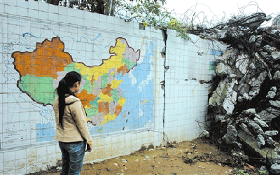 地圖的前面一幢樓房坍塌了,折斷的水泥柱子、裸露的鋼筋就躺在距離它僅2米多遠(yuǎn)處。地圖所在墻面上側(cè)是運(yùn)動(dòng)場(chǎng)右側(cè)是道路,北川“9·24”暴雨洪災(zāi)造成的泥石流也對(duì)它構(gòu)成嚴(yán)重威脅,所幸沒(méi)有被破壞。