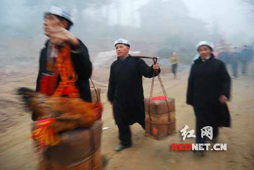 天還沒亮,新郎唐德武家的迎親隊(duì)伍便抬著花轎前往十多里外的銅錢坪村迎接新娘,和普通婚禮不同的是新郎并不在迎親隊(duì)伍中,帶隊(duì)的是花瑤婚嫁風(fēng)俗中特有的“媒人公”。在距離新娘家不遠(yuǎn)的地方擺下有辟邪含義的“五子飛棋”之后,三道攔門酒成了“媒人公”必須通過的考驗(yàn)。對歌、打蹈(新娘家的女性跳坐在媒人公膝蓋上)、打泥巴(將田里剛挑來的泥巴涂抹在“媒人公”身上),每個花瑤婚嫁元素都按照傳統(tǒng)習(xí)俗上演。一把由“媒人公”帶來、被新娘家掛上繡球的花傘是花瑤婚俗中最有特色的信物,它象征著新娘將自己的愛情隨著花傘送到新郎手中。