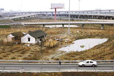 跨過一張已經(jīng)被撕裂的鐵絲網(wǎng),快速奔過兩條雙向六車道的高速公路和往上海方向的匝道,那呼嘯而過的車輛讓我不寒而栗。強(qiáng)壓住內(nèi)心的恐懼,繼續(xù)翻越往杭州方向的匝道,往前三百米,又穿越高架匝道,邁過雜草叢生、凹凸不平的地面,再往里前行二百米后,隱約看見一戶被條條匝道環(huán)繞著的小屋。據(jù)村民介紹,這條“長(zhǎng)征路”是唯一能到達(dá)王來英家的“通途”。