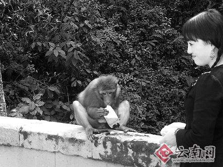 當時,兩只猴子正一前一后站在公路旁的擋墻上,一邊來回走動啃食游客“進貢”的食品,一邊不斷發(fā)出“;!钡暮鸾新,仿佛是在對圍觀的游人說:“快進貢些好吃的來,不然休想打此經(jīng)過!倍慌砸延袛(shù)輛路經(jīng)此地的車?吭诼愤,10余名游客正興致勃勃地圍著兩只猴子觀看,幾名膽大的游客正在接受猴子的命令,乖乖地向猴子奉上隨車攜帶的食品,以供他們享用。