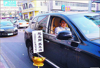 組圖中,一輛黑色保時(shí)捷正在行駛,前排一白衣中年男子將一雷人“釣具”伸出車窗外,邊行邊“釣”!搬灨汀笔且粋(gè)高爾夫球桿,“魚餌”是個(gè)“金元寶”,“垂釣”口號則是“想發(fā)財(cái)找朱!,字旁標(biāo)有一個(gè)手機(jī)號碼。據(jù)圖說介紹,該場景出現(xiàn)在2月20日的深圳市羅湖區(qū)寶安北路深圳市人才市場附近。