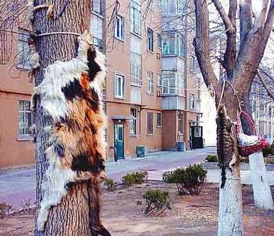 近日,在天涯、華商網(wǎng)等各大論壇都可看到這樣一個(gè)帖子——《慘無(wú)人道,殺死流浪貓吃肉后還剝皮綁在樹(shù)上》。點(diǎn)擊進(jìn)去可以看到,在某小區(qū)一戶人家門前的樹(shù)上,兩張貓皮一左一右被綁在那里,繩子分別從嘴部和尾部勒過(guò)。