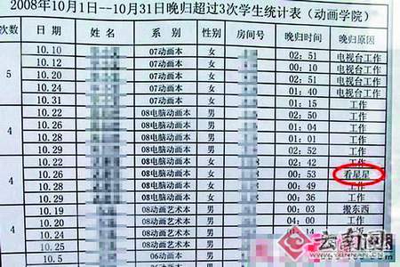 近日,北影校園內(nèi)張榜公布了各系晚歸宿舍的學(xué)生名單,有意思的是,學(xué)校竟然還把超過(guò)3次晚歸的詳細(xì)原因都公布了出來(lái)。昨天,有好事網(wǎng)友將這些名單傳到了網(wǎng)上。據(jù)記者觀察,學(xué)生們晚歸的理由五花八門(mén),有“電視臺(tái)工作”、“吃飯”,也有“拍戲”、“回家”,而動(dòng)畫(huà)學(xué)院一位女生的理由竟然是“看星星”!巴須w表格”一時(shí)間被無(wú)數(shù)網(wǎng)站轉(zhuǎn)載,點(diǎn)擊率一路攀升,而廣大網(wǎng)友的評(píng)論似乎也并不客氣。因?yàn)楸庇笆撬囆g(shù)院校,加上娛樂(lè)圈給人的感覺(jué)是魚(yú)龍混雜,很多人的矛頭直指藝術(shù)院校學(xué)生的素質(zhì)。