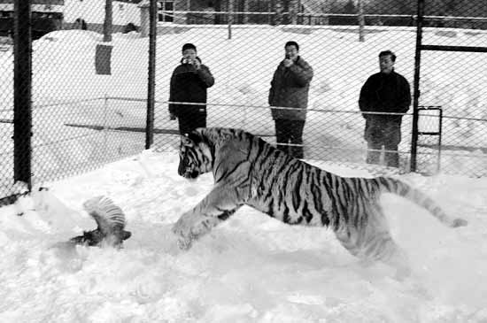 孫師傅拎著一只大公雞走近虎圈,將雞扔進去,雞正好掉落到“精神病”的前爪處。它并不急于吃雞,而是用前爪輪番拍打幾下。此時,剛才還活蹦亂跳的活雞耷拉著雞冠,一動不動,真地“呆若木雞”。