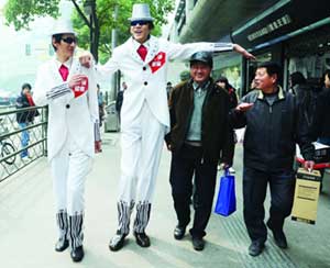 提起這兩個(gè)小伙子,南京市民可能并不陌生。2米26的那個(gè)叫張夢(mèng)永,2米12的叫秦為超,快報(bào)曾經(jīng)報(bào)道過(guò)他倆的“雙塔組合”。昨天下午兩點(diǎn),兩“巨人”出現(xiàn)在山西路上,穿著定制的白色禮服,戴著高高的白色禮帽,再配上酷酷的墨鏡,所經(jīng)之處立刻被圍得水泄不通!巴郏阌幸γ鞲呙?”“你們的腿是真的假的啊?”“這么大腳,是真的么?”圍觀的市民們提出千奇百怪的問(wèn)題,兩個(gè)小伙子耐心地一一解答。