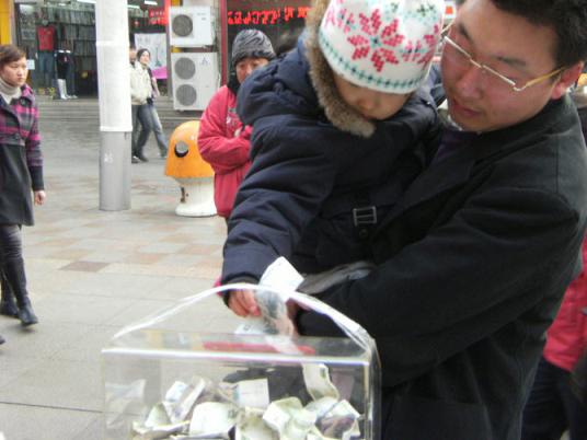“我和我的好姐妹王靜一起,在青島市區(qū)準備組織這次捐款活動!眲⒈恼f,“開始的時候由于城管管理的比較嚴格,所以只能通過市北區(qū)紅十字會協(xié)調(diào),最后允許我們的捐款活動可以組織兩天。”