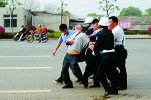 據(jù)陳勇介紹,昨日下午4時(shí),他正在中南大學(xué)新址的拆遷現(xiàn)場采訪。當(dāng)時(shí),有拆遷戶拉著橫幅,與數(shù)十名身著城管和聯(lián)防制服的男子對峙。“剛開始還算平靜”,不多時(shí),五六名穿制服者圍毆一名拆遷戶。