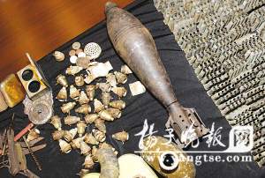 為什么如此熱衷于征集侵華日軍遺物?聽(tīng)了張廣勝的自述,記者才知道原來(lái)他的外公就是在抗日戰(zhàn)爭(zhēng)中被日軍將雙眼弄瞎的!靶〉臅r(shí)候我常聽(tīng)身邊的老人們講故事,講到日本侵略者的暴行,在我心里留下了深深的烙印。后來(lái)工作了,有一次下鄉(xiāng),我還記得那是1998年,偶然在一個(gè)山村里見(jiàn)到一個(gè)放羊人,他將頭羊拴在地上吃草,而我驚訝地發(fā)現(xiàn),他用來(lái)拴頭羊的那根鐵桿竟然是日本二戰(zhàn)時(shí)最常用的三棱式刺刀。這使我一下子想起許多童年聽(tīng)到的故事,我覺(jué)得有必要把這個(gè)刺刀帶回去給大家看看,從這開(kāi)始我經(jīng)常利用業(yè)余時(shí)間上山下鄉(xiāng),去尋找當(dāng)年日軍在東三省留下的遺物!