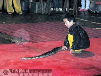 表演團(tuán)體的主持人稱,這條蟒蛇有5公斤多重,“小毛毛”(年紀(jì)較小的表演人員)待會兒將斗蛇,而且還將騎在蟒蛇身上,就像騎馬一樣。當(dāng)時(shí),小毛毛不斷挑逗著蟒蛇,不時(shí)怕打著蟒蛇的尾巴。該團(tuán)體主持人還說:“我們還有一條30多公斤的蟒蛇,小毛毛待會也將騎在它身上。”