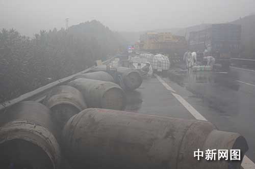事故的影響,當(dāng)天上午9點(diǎn)多,高速公路上被堵車輛綿延數(shù)公里。大掛車雖已被吊離,但現(xiàn)場(chǎng)地面上仍冒著白煙,附近散落著許多木箱、玻璃碎片和一些裝有危險(xiǎn)品的大桶。安監(jiān)、環(huán)保等部門做了現(xiàn)場(chǎng)勘查,工作人員用石灰中和等多種措施來(lái)減少酸性物質(zhì)對(duì)周邊土壤的腐蝕。
