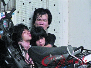 當(dāng)三輪摩托車開到城東派出所門前,杜某民嫌車速太慢,叫司機(jī)開摩托車進(jìn)入城東派出所院內(nèi)。下車后,杜某民用小刀架在小李的脖子上,用手扣住小袁的脖子(見圖),大聲叫喊:“有人殺人了,快報(bào)案”,然后把小李、小袁兩人推到城東派出所飯?zhí)靡唤锹洌纸校骸鞍阉泄捕冀谐鰜。?/p>