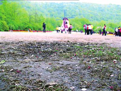 杭州市園林文物局花港管理處辦公室主任馮剛說(shuō),按太子灣的規(guī)模,人數(shù)超過(guò)1.1萬(wàn)人次就要啟動(dòng)應(yīng)急預(yù)案,但清明節(jié)3天游客數(shù)量超過(guò)20萬(wàn)人次,70%是外地游客。為防止意外,疏散人群,公園只能把觀賞草坪開(kāi)放。后果是一半草坪被損,成片草坪被踩成黃泥地,游客為了拍照,踩踏、搖落的觀賞花不計(jì)其數(shù)。