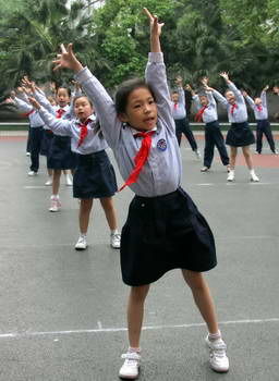 模仿古代“請”、“讓”、“孝”等系列動作,編制成一套極有古典韻味的體操!再配上《漁舟唱晚》的背景音樂,一邊“做操”一邊大聲朗誦國學(xué)名篇或者名句……昨日,記者獲悉,我市雙眼井小學(xué)耗時(shí)數(shù)月,創(chuàng)作出了一套“國學(xué)操”,將體操和國學(xué)的誦讀融二為一。據(jù)悉,這是目前全國第一套“國學(xué)操”。